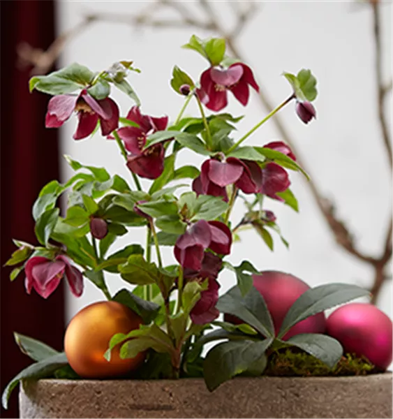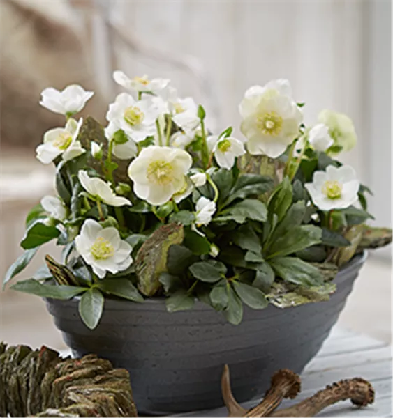 Gut geeignete Kübelschönheiten sind jetzt Zuckerhutfichten und die in vielerlei Laubfarben erhältlichen Hülsen, auch Ilex genannt – besonders die Beeren tragenden unter ihnen. Ist Platz genug da, empfehlen sich großblättrige Mahonien, zumal sie schon bald nach Jahresbeginn blühen und dabei atemberaubend stark duften. Weitere Pflanzen, die rund um die kalte Jahreszeit mit Blüten überraschen, sind z. B. winterblühende Zierkirsche, Zaubernuss, Kletterjasmin und die Weiße Forsythie, auch Abeliophyllum genannt. Zur Unterpflanzung eignet sich Beerentragendes, wie Rebhuhnbeere, aber auch Blühendes wie Violen, Hornveilchen und ganz besonders Christrosen. Dazu ein paar Blumenzwiebeln mit verwenden. Als Füller stecken Sie Koniferenzweige zwischen die Unterpflanzung in die Pflanzerde. Abrundend ausgeschmückt wird schlussendlich mit Stickern und Schleifen: von wegen „bonjour tristesse“! Willkommen, Winter!