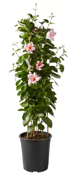 An einem sonnigen Platz blüht die Dipladenien-Pyramide (Dipladenia-Hybride) so richtig auf. Die wunderschönen weiß, rosa, rot oder gelb gefärbten Blüten zieren Ihren Balkon oder die Terrasse fast den ganzen Sommer lang. Je nach Sorte erreicht die Kletterpflanze eine Höhe von 3 bis 6 Metern, darum ist eine Kletterhilfe unerlässlich. Gießen Sie die Dipladenie vom Frühjahr bis Herbst reichlich, Staunässe sollte vermieden werden.