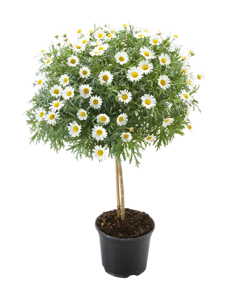 Das weißblühende Margeriten-Stämmchen (Argyranthemum frutescens) sorgt für ausgelassene Stimmung an einem sonnigen bis halbschattigen Standort. Regelmäßige