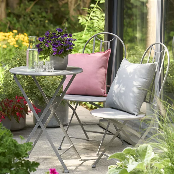 Machen Sie es sich gemütlich! Das zusammenklappbare Balkonset, bestehend aus einem kleinen runden Tisch und zwei Stühlen, passt mit seinem klaren Design an jeden Rückzugsort. Bequeme Kissen in Pink und Grau runden diese Sitzgelegenheit harmonisch ab.