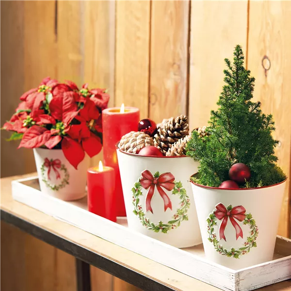 Diese festlichen Übertöpfe bringen Weihnachtszauber in jedes Zimmer. Der cremefarbene Grundton kombiniert mit dekorativen Ilex- und Schleifenmotiven versprüht nostalgischen Charme und setzt Pflanzen wie Weihnachtsstern, Tanne oder kleine Arrangements hübsch in Szene.