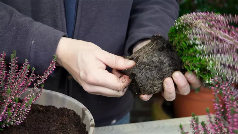 Nehmen Sie die Heidekrautpflanzen aus dem Pflanztopf. Zupfen Sie vor dem Einsetzen in die Erde jeweils den Ballen mit den Fingern ein wenig auseinander, um die Wurzeln etwas zu lockern. Das ist deshalb wichtig, damit sich die Wurzeln besser mit der neuen Erde verbinden können. Setzen Sie die Pflanzen Stück für Stück in die Schale.